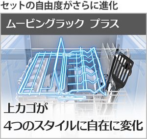 上かごが左右に動くムービング機能に加え、上かごが4つのスタイルに変化するムービングラックプラス。