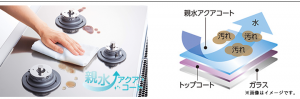 ・ガラスの天板には、こびりついた汚れも水のチカラで落としやすくする親水アクアコート塗装を施しており、日々のお手入れが簡単です。